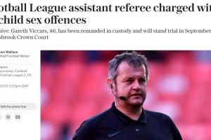 46岁的加雷斯·维卡斯是一名边裁,自2018年以来还被选为足总杯和联赛杯比赛的官员,他被控12项与儿童发生性行为的罪名。此外,他还被控两项与儿童进行性交流的罪名;一项在性诱导后与儿童会面的罪名;以及一项在儿童面前从事性行为的罪名。